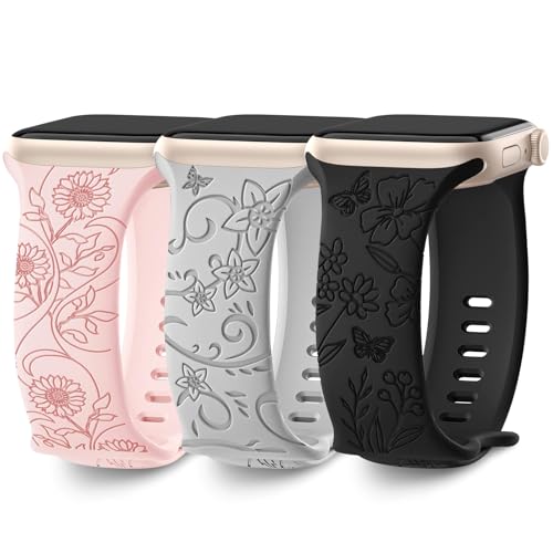 AMSKY 3-delat Blommigt Graverat Armband Kompatibel med Apple Watch 40mm 44mm 42mm 46mm 41mm 45mm 38mm 49mm Dam, Silikon Kompatibelt med iWatch Series 11 10 9 8 7 6 5 4, SE 3 2 1