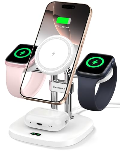 SwanScout 709M Dual Charger Stand för Apple Watch, Magnetisk Trådlös Laddare för Phone 16/15/14/13/12 Series, Laddningsstation för Apple Watch 9/8/7/6/5/4/3/2/SE 2, för Air-pods 4 (White)