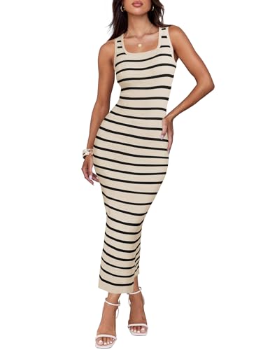 ZESICA Dam sommar randig figurnära midi-klänningar 2024 ledig ärmlös rund hals ribbad stickad strand semester lång klänning, Aprikos, M
