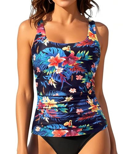 Aqua Eve Tankini Tops for Women Swimwear Top Only Tummy Control Bathing Suit Top No Bottom (Available in Plus) Black and Colorful Flower M