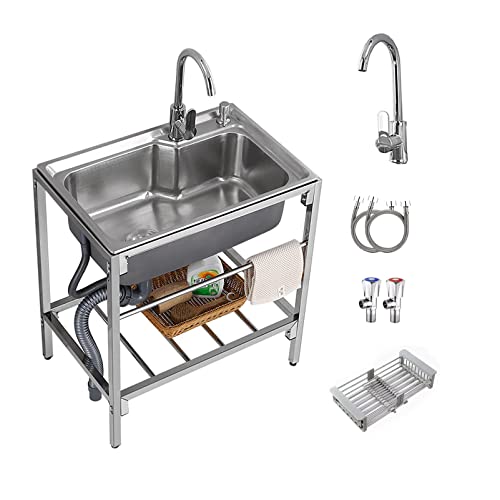 Rostfritt stål tvättstuga köksvask fristående diskbänk kommersiell, ett skålfack arbetsbänk handfat kommersiellt handfat med kran, för utomhus inomhus, garage, tvätt/tvättstuga