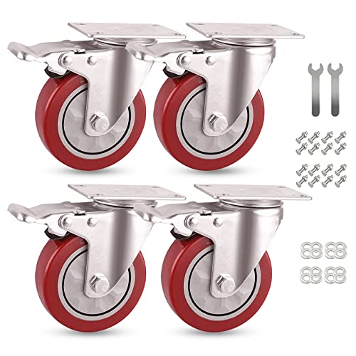 BAOLIHUI 4-pack 100MM möbelhjul med broms tunga hjul 600kg röda rullar för möbler transportrullar arbetsbänk verktygsvagn pallar transportrullar rullar med skruvar