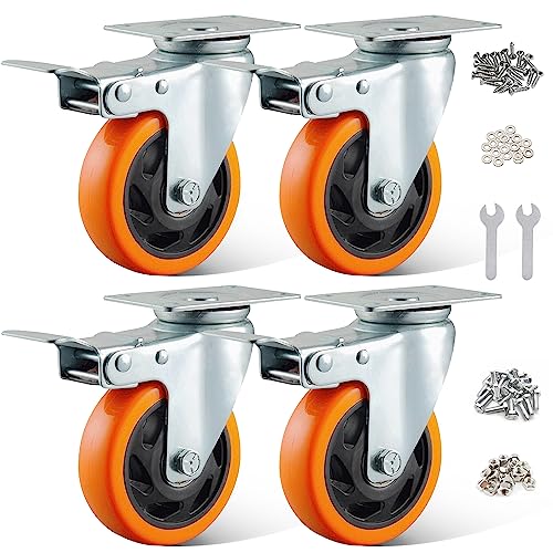 BAOLIHUI 4-pack styrrullar för möbler, orange, 100MM möbelhjul med broms, tunga hjul 600kg, rullar för möbler, transportrullar, arbetsbänk, verktygsvagn, pallar