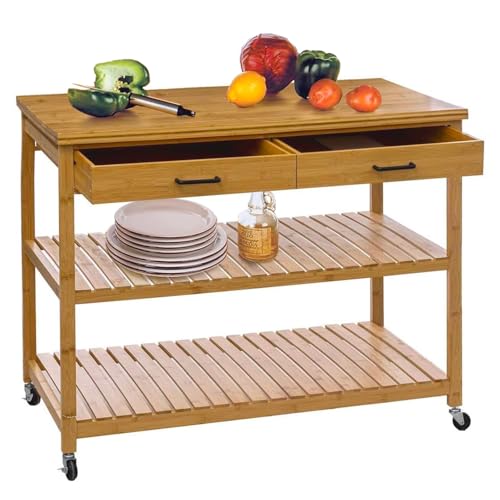 Avilia Ö Bambu köksvagn 3 nivåer med hjul 90 x 108 x 85 cm - övre arbetsbänk två förvaringshyllor och två lådor perfekt för matlagning och förvaring av föremål och redskap