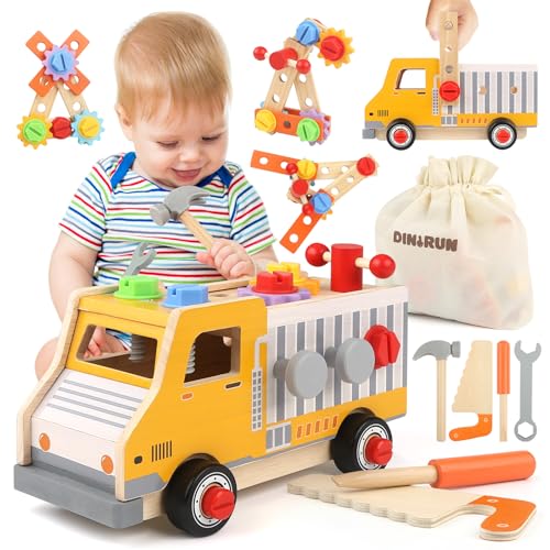 DINORUN Verktygsväska, barn, barnverktyg, barnleksaker, träleksaker, Montessori-leksak från 2 3 4 år, arbetsbänk, barn, gåva, pojke, flicka, 3 4 5 6 år (47 stycken)