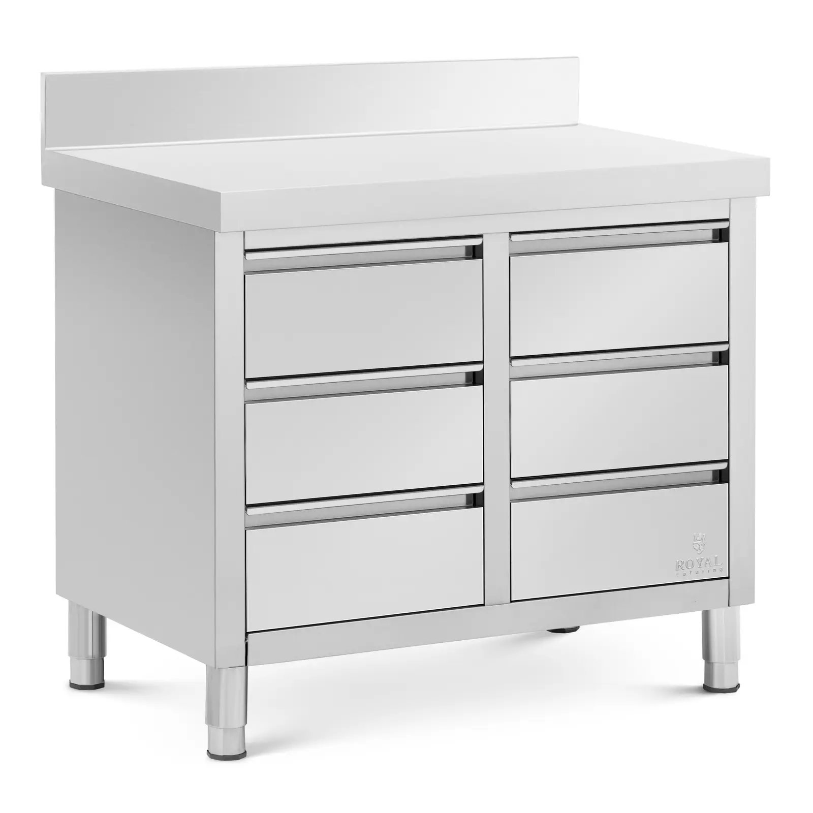 Royal Catering Rostfri arbetsbänk - 100 x 60 cm 72 kg 6 lådor med uppställningsställ
