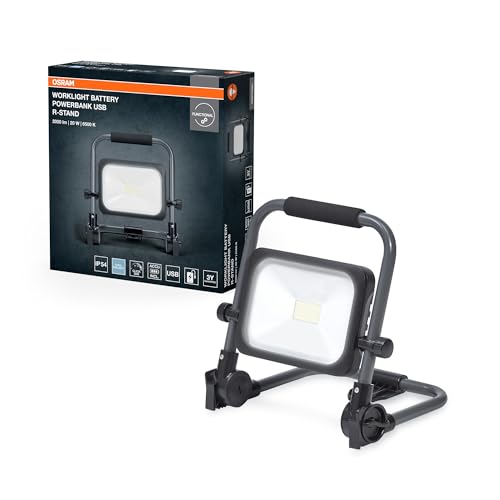 OSRAM VAL BAT LED-arbetslampa, mörkgrå/svart, 20W, 2000lm, kall vit ljusfärg, batteridriven, USB-laddningsfunktion tack vare integrerad powerbank, portabel, IP54 skyddsklass, 6500K