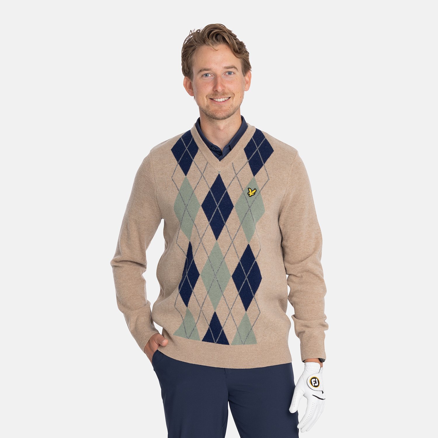 L&S Tröja Lambswool Blend Argyle V-Neck: Beige/Green (X933) Small