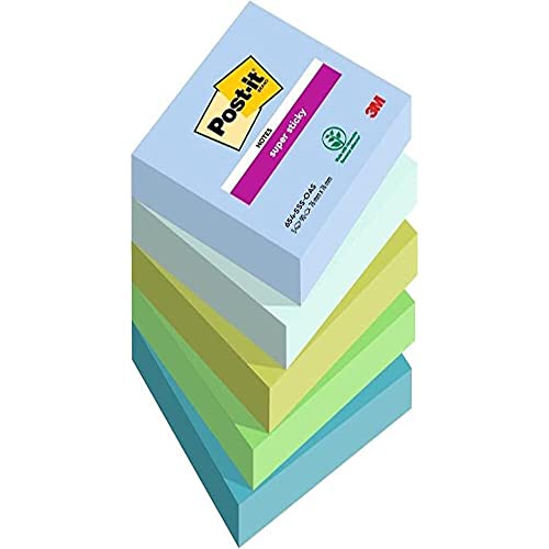 Post-it Super Sticky Notes Oasis färgsamling, paket med 5 dynor, 90 ark per dyna, 76 mm x 76 mm, blå, grön – extra klisterlappar för anteckningar, att göra-listor och påminnelser