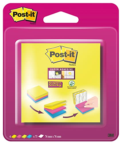 Post-it 2014BYFG självhäftande anteckningar Super Sticky Multi Notes, 76 x 76 mm, 4 block med 75 ark, neongrön, ultrablå, gul, rosa