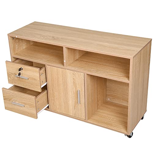 BAKAJI Multifunktionell träskrivarhållare med 3 hyllor, 2 lådor med nyckel och 1 förvaringsskåp med fack, kontorsskåp arkiv dokumenthållare med rörliga hjul, 100 x 35 x 65 cm (ek)