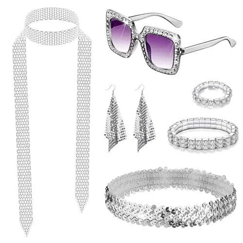 70-Talet Disco Kostym Set Med Solglasögon, Halsduk, Örhängen, Armband, Ring och Pannband - Tillbehör för Damer Med Glitter Smycken