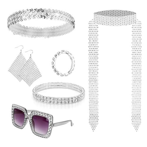 ZHXGO 6 stycken 1970-talet disco tillbehör, disco outfit damer tillbehör, discokula kostym tillbehör set med solglasögon lång halsduk örhängen armband ring pannband, disco damer glitter smycken,