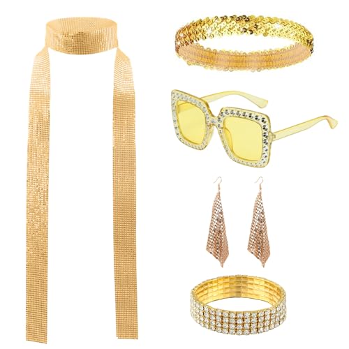 TUONYIS 6 stycken 70-talet 80-talet disco tillbehör tillbehör disco outfit damer, glitter paljetter halsduk, solglasögon örhängen armband och pannband, för karneval kostym fest (guld)