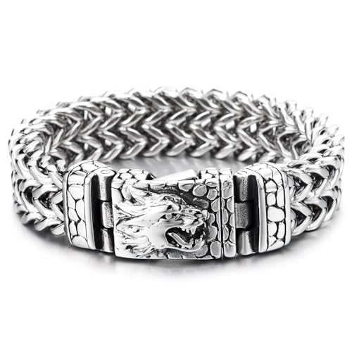 COOLSTEELANDBEYOND Herr Rostfritt stål Varg Huvud Armband, Stor Länk Frank Kedja Barbada, Textur Skala, Viking Gotisk, Longitud 21.5CM, Ancho 1.6CM, Rostfritt stål, Ingen ädelsten