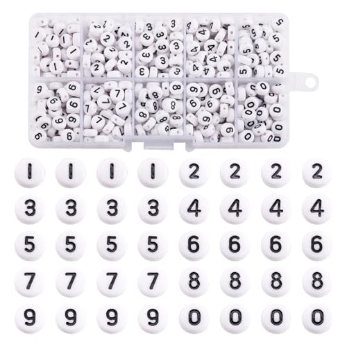 Cheriswelry Bokstavspärlor av akryl, 720 st. vita pärlor med svarta siffror 0–9, set med platta, runda pärlor/mellandelar, 7 mm, berlocker för armband, halsband, årsdag smyckestillverkning