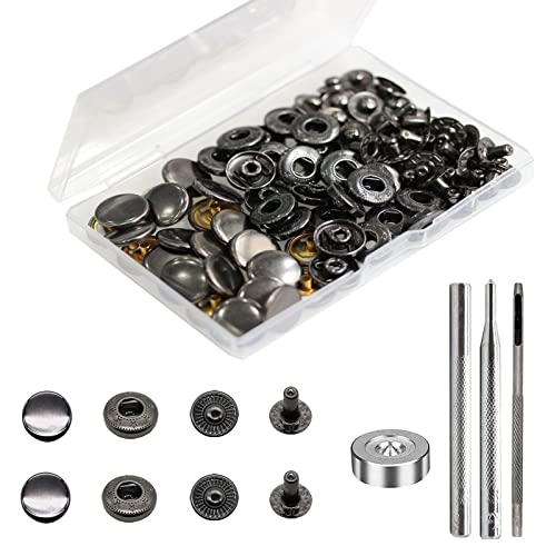 BetterJonny Kit med 24 uppsättningar kraftiga 15 mm metalltryckknappar för läder med nitar och 4 monteringsverktyg för armband och kläder som jackor och jeans (svart nickel (Gun Black))