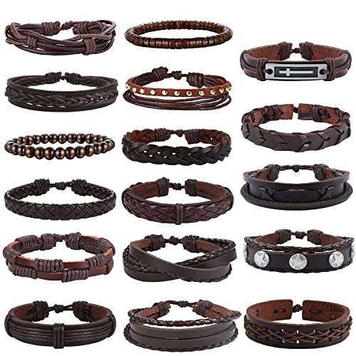 MILACOLATO Set med läderarmband för män, 17 st justerbara punk-flätade armband för män och kvinnor - svart rep med pärlor - vintage armband, 7-9.5 inches, Läder trä