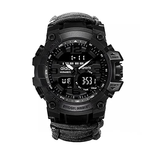 XHJL Digitala armbandsur, Unisex nödsportmilitära taktiska klockor med paracord/visselpipa/eldtändare/skrapa/kompass och termometer, 6-i-1 utomhusutrustning, Svart, rem