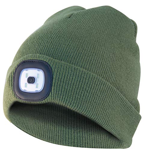 Velamp CAP05 LIGHTHOUSE Beanie with LED Front Light, 100 Lumen, Rechargeable, Washable. for Camping, Jogging, Work, Army Green, Unica