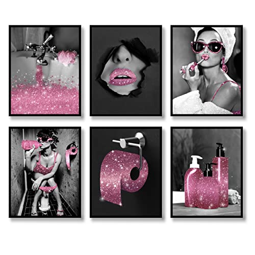 Luodroduo Fashion Wall Art Set of 6 Pink Black and White Glam Glitter Tissue Canvas Posters - Bathroom Decor - Modern Women Funny Artwork (B&W PINK, 8"x10" UNFRAMED)