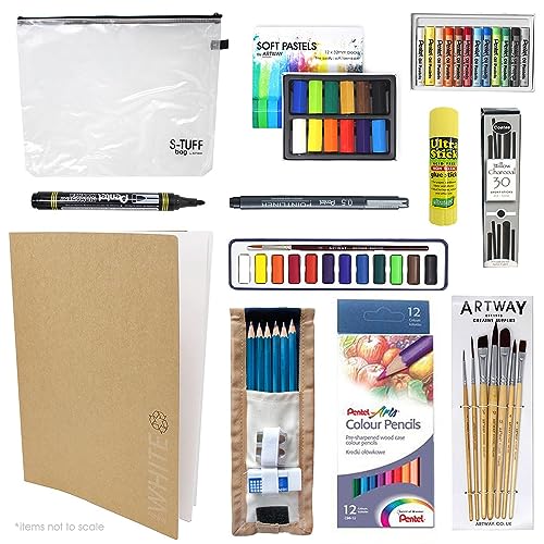 Artway - Art Kit - 14 Items Including Pencils Brushes Pastels Paints and More - Ideal for GCSE and A-Level - A3
