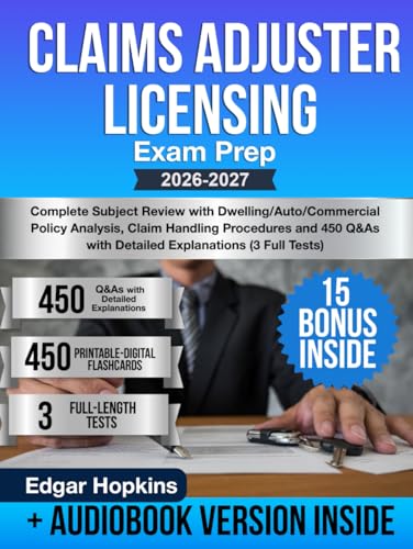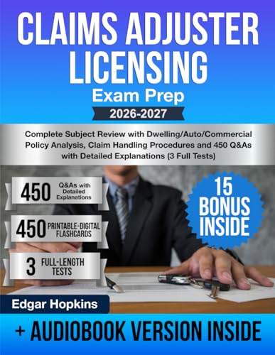 Claims Adjuster Licensing Exam Prep: Complete Subject Review with Dwelling/Auto/Commercial Policy Analysis, Claim Handling Procedures and 450 Q&As with Detailed Explanations (3 Full Tests)