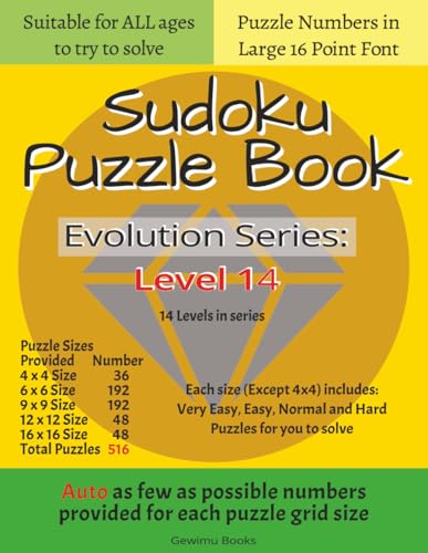 Sudoku Puzzle Book: Evolution Series Level 14, AUTO As few as possible puzzle numbers provided for each puzzle grid size of 4x4, 6x6, 9x9, 12x12, 16x16