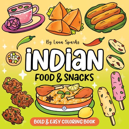 Indian Food & Snacks Coloring Book: 57 Simple Bold and Easy Designs for Adults & Kids, Featuring Fun & Relaxing Asian Cuisine, Desserts, Sweet Treats and Drinks