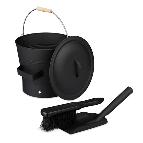 Relaxdays Askhink med lock och sopset, 7,5 l, inkl. askkvast och eldstadspad, askbehållare med handtag, svart