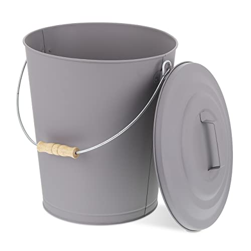 Relaxdays Askhink med lock, 12 liter, kaminhink, stål och trä, askbehållare med handtag, öppen spis, ugn och grill, grå