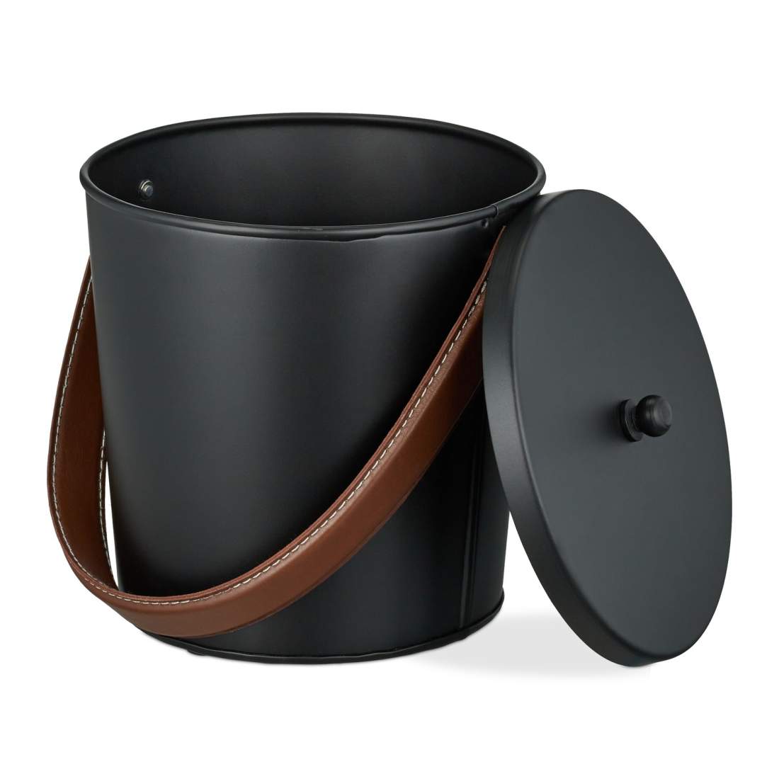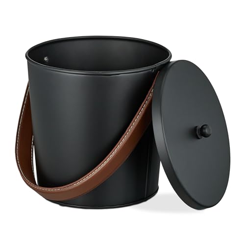 Relaxdays Askhink med lock, 4,5 liter, asktunna med läderhandtag, för kol och aska, öppen spis, ugn, svart/brun