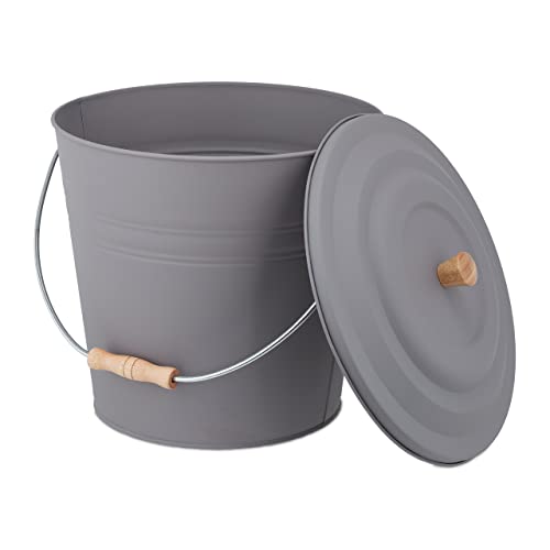 Relaxdays Askhink med lock, 12 liter, asktunna med bärhandtag, för kol och aska, rund, öppen spis, ugn och grill, grå