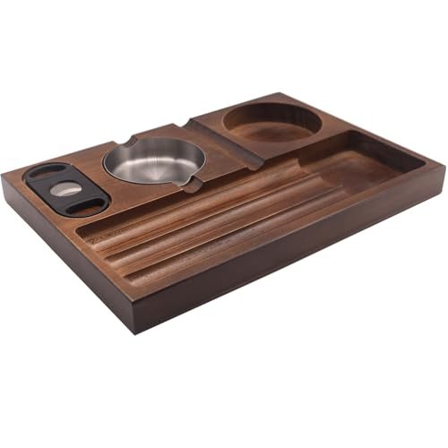 Cigarraskkopp, trä cigarrer askkopp med cigarrskärare, cigarrhållare och whiskystativ – 3 cigarrslitsar, tunga cigarrer tillbehör för hem kontor utomhus