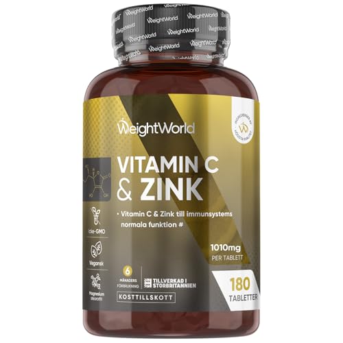 Vitamin C Zink Tabletter - 1010 mg - 6 månaders förråd - 180 veganska tabletter med askorbinsyra & zinkbisglycinat - Alternativ till vitamin C kapslar & pulver - 1 tablett dagligen - från WeightWorld