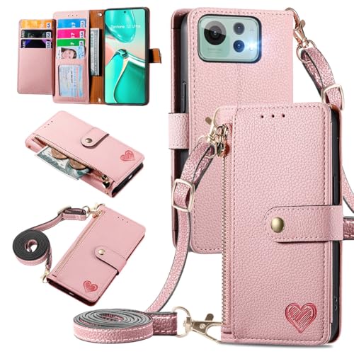MOJIA Flip-fodral för ASUS Zenfone 12 Ultra, läder dragkedja flip plånbok fodral skydd [med axelbälte], korthållare multifunktionellt antifall telefonskal. Rosa