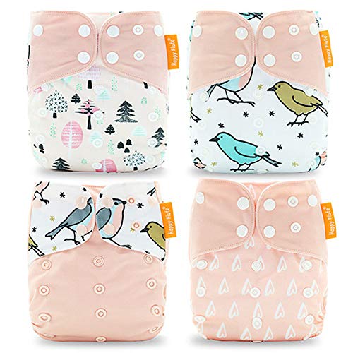 HahaGo 4 st babytygblöjor, tvättbara och återanvändbara blöjor, inlägg allt-i-ett-fickblöja för de flesta bebisar och småbarn (ljusrosa, fågel)