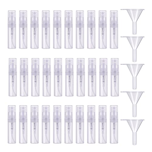 Lahviuu Mini sprayflaska, 30 stycken 2 ml transparent plast mini sprayflaskor atomizer parfym sprayflaskor, för parfym kroppsvård vätska kosmetika resor (med 5 stycken tratt)