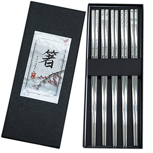 Bosdontek Ätpinnar i metall, återanvändbara, 5 par ätpinnar i rostfritt stål, diskmaskinssäkra med graveringsmönster, japanska ätpinnar, lätta att rengöra, presentset (silver)