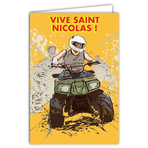 Öppningskort Vive Saint Nicolas Happy Party 6 December Quad ATV offroad sporthjälm för barn eller tonåring pojke vän pojkvän son brorson dotter - med vitt kuvert format 12 x 17,5 cm