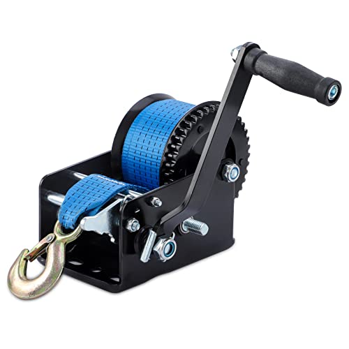 SPARKWHIZ Båtsläp, vinsch handvinsch, 3300 lbs manuell vinsch med kraftig 10 m (33 fot) nylon blå rem handvevsch vinsch med krok för släpvagn ATV båt