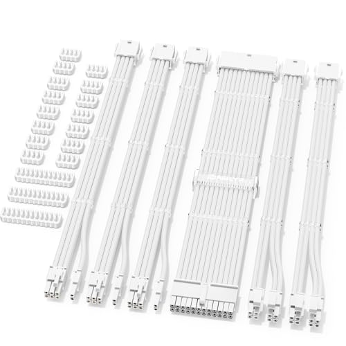 Sirlyr Vit PSU-förlängningskabelkit, PC-strömförsörjningskablar, förlängningsmod – 1 x 24 stift ATX/2 x 8 (4 + 4) stift EPS/3 x 8 (6+2) guldpläterad stift PCIE GPU, ljus vit nylonflätad, 30 cm, 6 kit