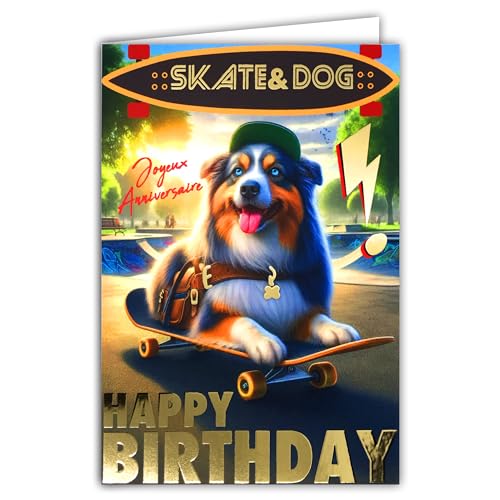 67-1269 födelsedagskort hund skateboard guld text glänsande guld och kuvert 12 x 17,5 cm Australian shepherd husdjur med keps skatepark medalj halsband promenad i parken