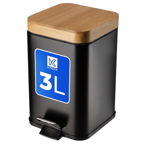 KADAX Avfallsbehållare av pulverlackerat stål, 3 l, hink med hink och fotpedal, soptunna med automatisk sänkning, papperskorg med bambulock (svart)