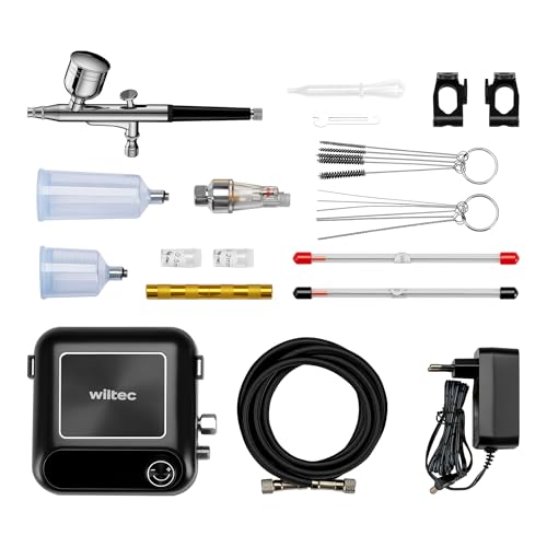 Wiltec HS-A9K Kompressor set 1,5 bar autostop, Airbrush kit med olika munstycken airbrush tillbehör mit 12 V tryckluft