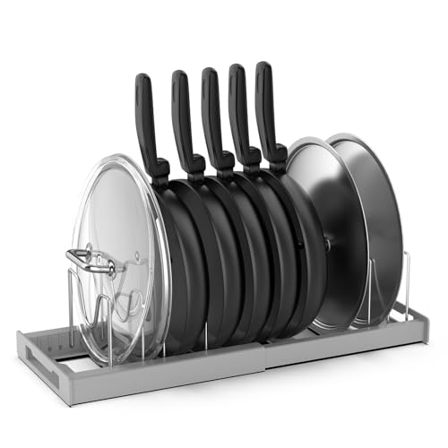 Anhow Grytlockshållare, stekpannehållare, utbyggbar grythylla för lådor, kastruller med 7 justerbara avdelare för kastruller och pannor – grå