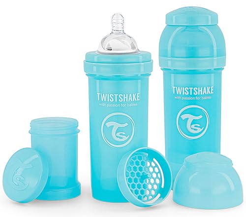 Twistshake 2-pack Anti-kolik Nappflaskor med Pulverbehållare och Mixernät - 260ml | Dinapp i silikon med långsamt flöde | BPA-fri Nappflaska | 2+ månader | Blå