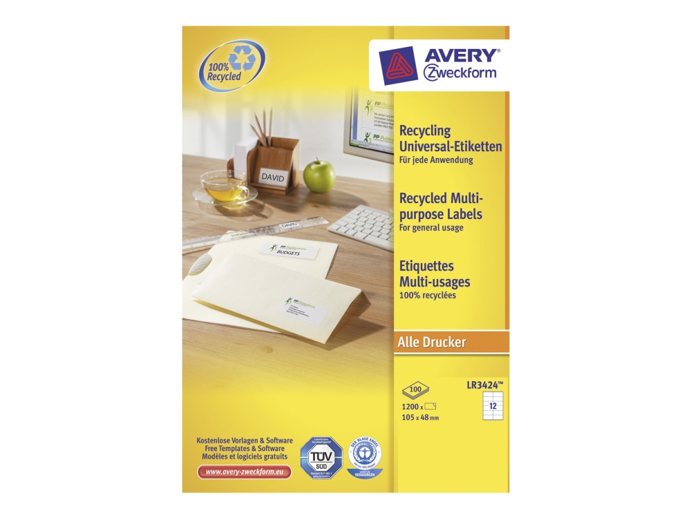 Avery Quickpeel Recycled Labels Lr3424 - Vit - 48 X 105 Mm 1200 Etikett (Er) (100 Ark X 12) Återvunna Etiketter