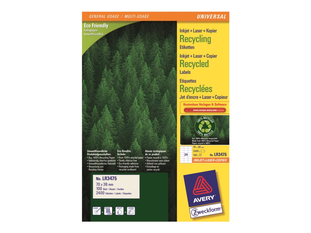Avery Quickpeel Recycled Labels Lr3478 - Vit - A4 (210 X 297 Mm) 100 Etikett (Er) (100 Ark X 1) Återvunna Etiketter