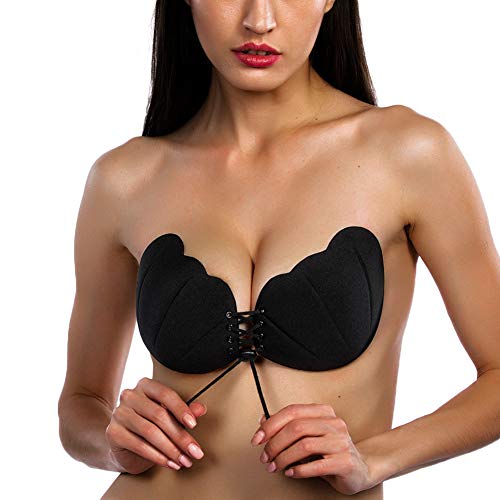 YUEMION Dam axelbandslös självhäftande bh push up silikonbehå osynlig bh med dragsko för bygg charmig klyvning, svart, D, svart, D